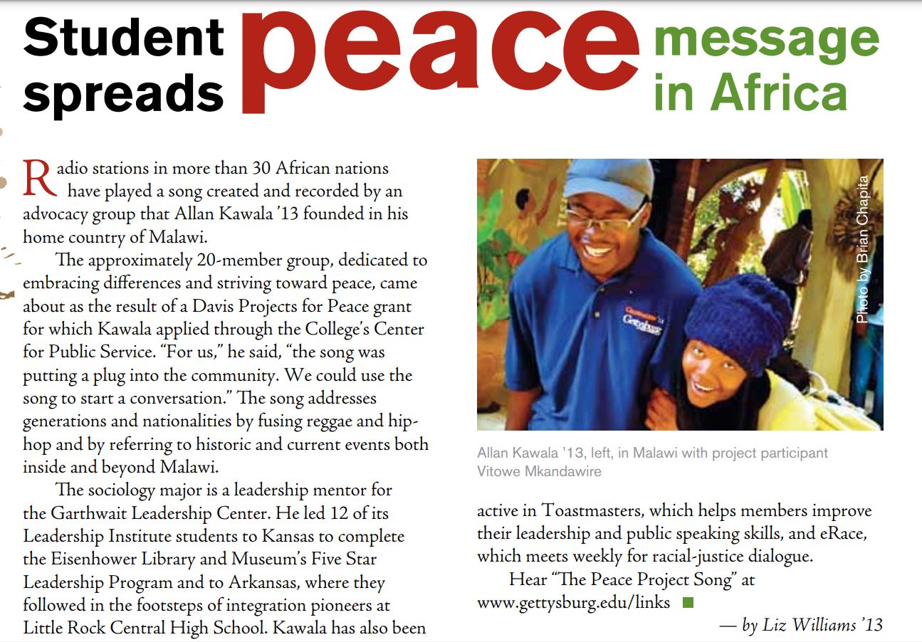 - “Student spreads peace message in Africa,” Gettysburg: Our College’s Magazine, Winter 2013