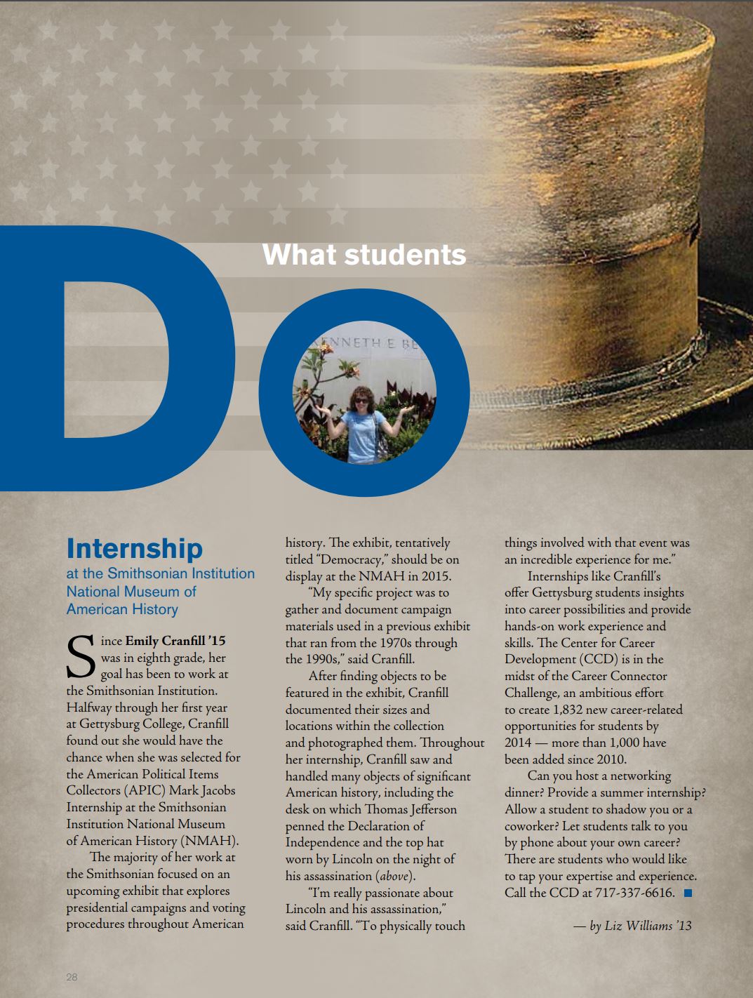 - “What students do: Internship at the Smithsonian Institution,” Gettysburg: Our College’s Magazine, Winter 2013